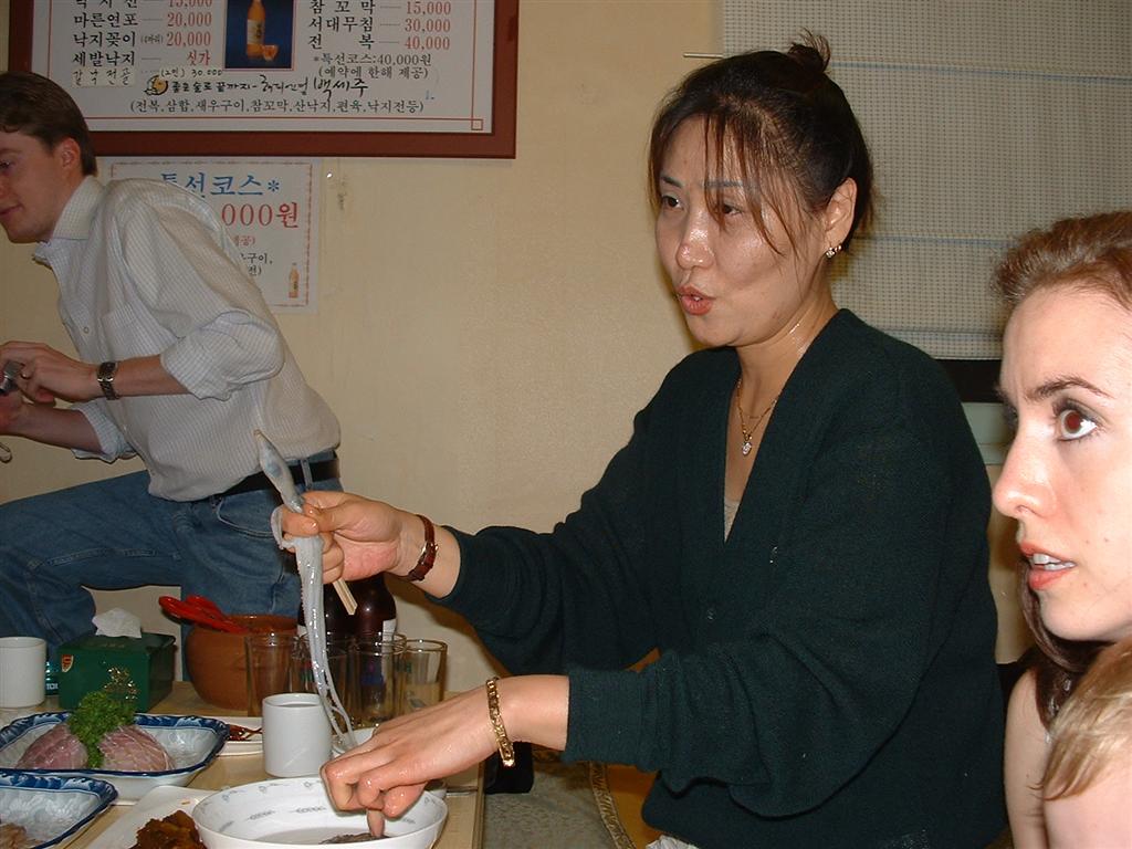 She now stretches it out and removes the grippy teeth things from the suckers. The tentacles are then twisted around the head to make a Nakchi lollypop. After dipping it in sesame oil it is then passed to you to begin work.
